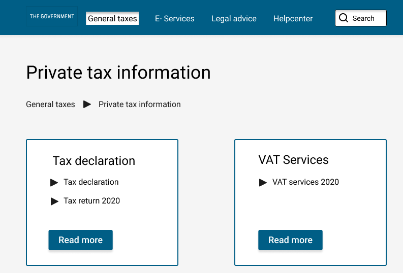 For the governmental website I used a blue colour with a light background and dark text. Focusing on tax questions which the user could navigate around. For one criterion we would also have a tax calculation form. The governmental website was targeting adults who have questions or need help with tax information.
